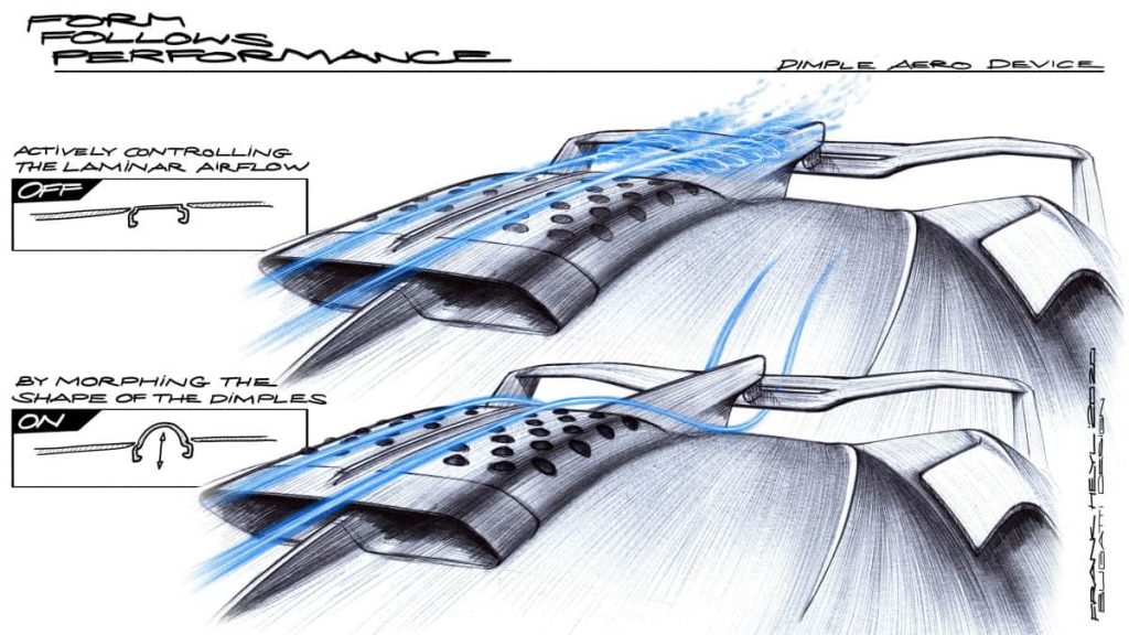 Nul besoin d’être scientifique pour comprendre l’effet de la balle de golf : ses alvéoles réduisent tellement la résistance de l’air qu’avec la même force de frappe, elle vole environ deux fois plus loin qu’une balle de golf lisse. La raison est identique : les alvéoles à la surface de la balle créent des turbulences qui permettent à l’air de mieux adhérer à la surface si bien que l’écoulement tourbillonnaire et ainsi la résistance sont considérablement réduits dans le sillage de la balle. Ballerstein simule des corps d’essai couverts d’alvéoles afin de concrétiser son idée. Après son mémoire de master, il décide de rester chez Bugatti tout en travaillant sur sa thèse auprès de l’Institut für Flugzeugbau und Leichtbau (Institut de construction aéronautique et légère) de l’Université Technique de Brunswick. Le projet du Bolide lui offre alors le véhicule idéal pour continuer à faire avancer son idée.