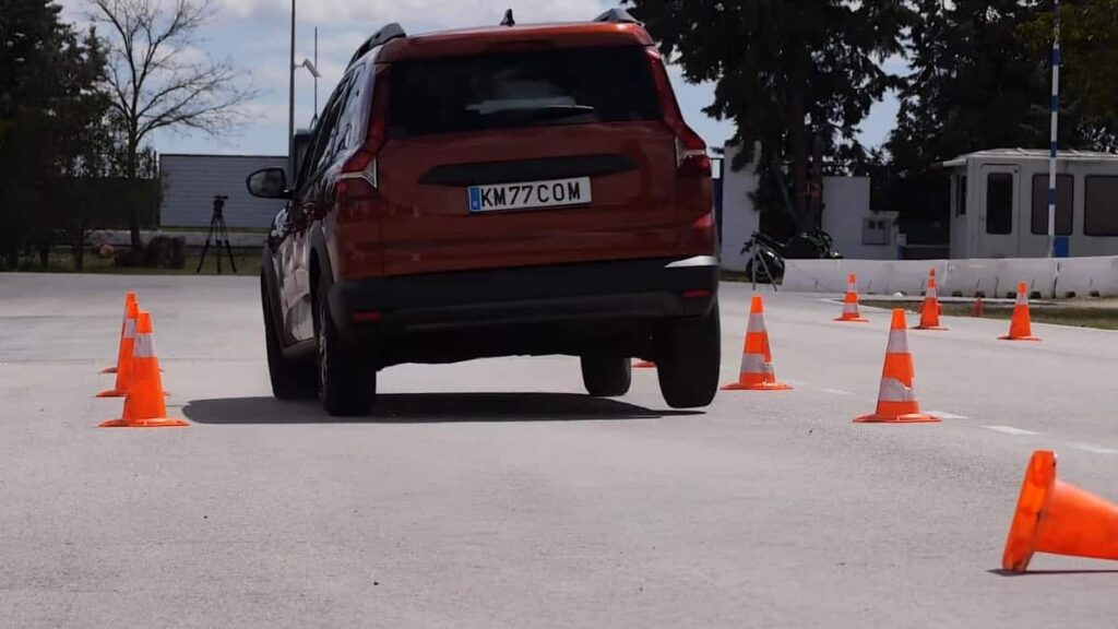 A 80 kilomètres à l’heure (50 miles à l’heure), le train avant du Dacia Jogger glisse, produisant le phénomène de sous-virage, ainsi le véhicule n’arrive pas à enchaîner les changement de direction afin de réussir l’épreuve du slalom. « Il est très difficile de diriger la voiture là où le conducteur le souhaite », explique le journaliste essayeur.