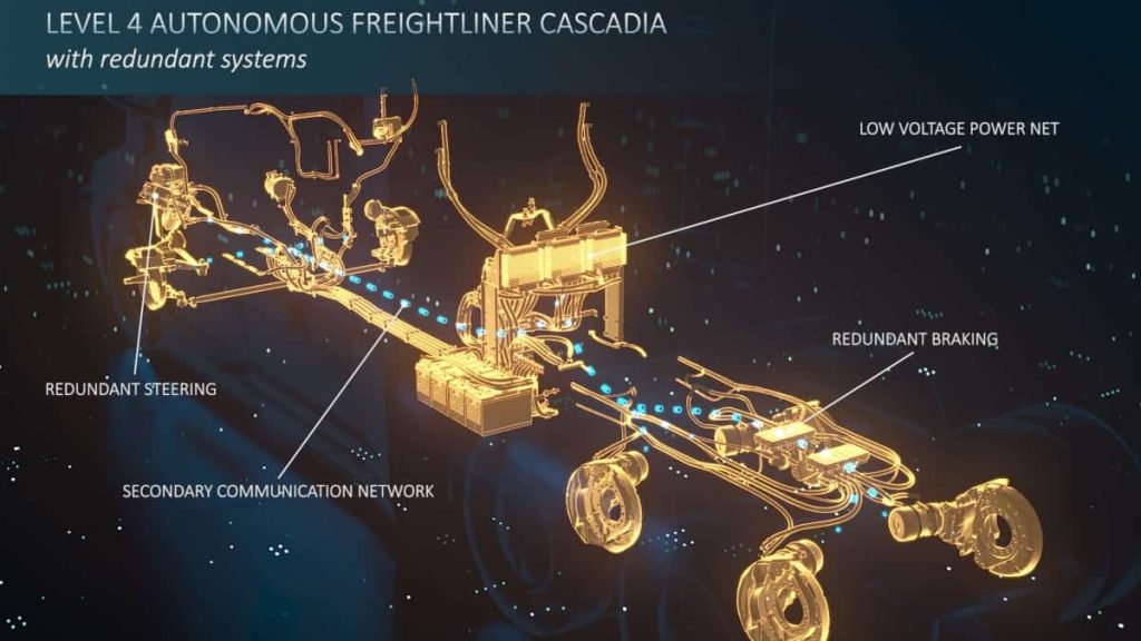 Plus de 1 500 exigences nouvelles et uniques ont été identifiées par Waymo Via. L’équipe d’ingénieurs de Daimler Trucks North America LLC (DTNA) développe et met en œuvre ces exigences au cours du processus de développement du véhicule. Par exemple, alors que les systèmes de freinage pneumatiques d’aujourd’hui ont des attributs opérationnels défaillants, les véhicules de niveau 4 de Daimler Truck ont un niveau supplémentaire de redondance électronique, utilisant deux unités de contrôle électronique (ECU) – un système primaire et un système secondaire. Ensemble, ils assurent la pleine performance des freins, afin d’exécuter en toute sécurité une manœuvre à risque minimal au cas où l’un des systèmes ne fonctionnerait pas correctement.
