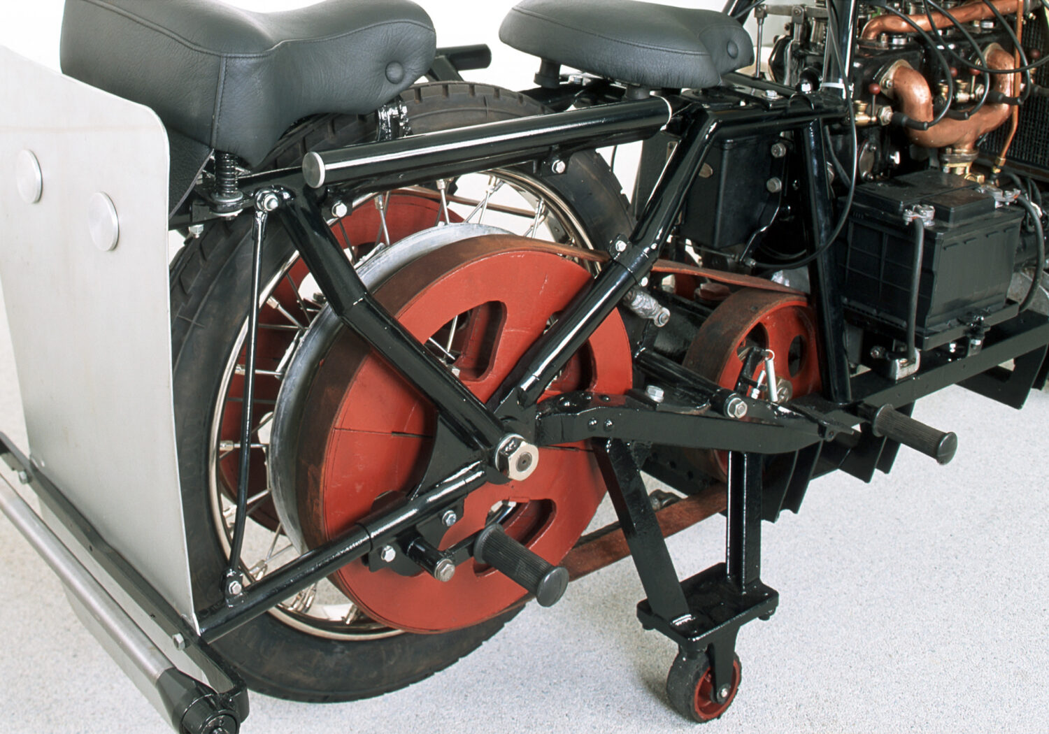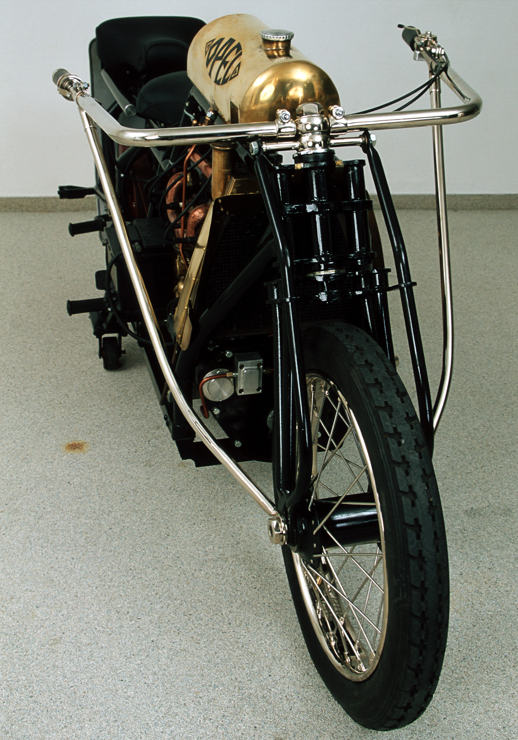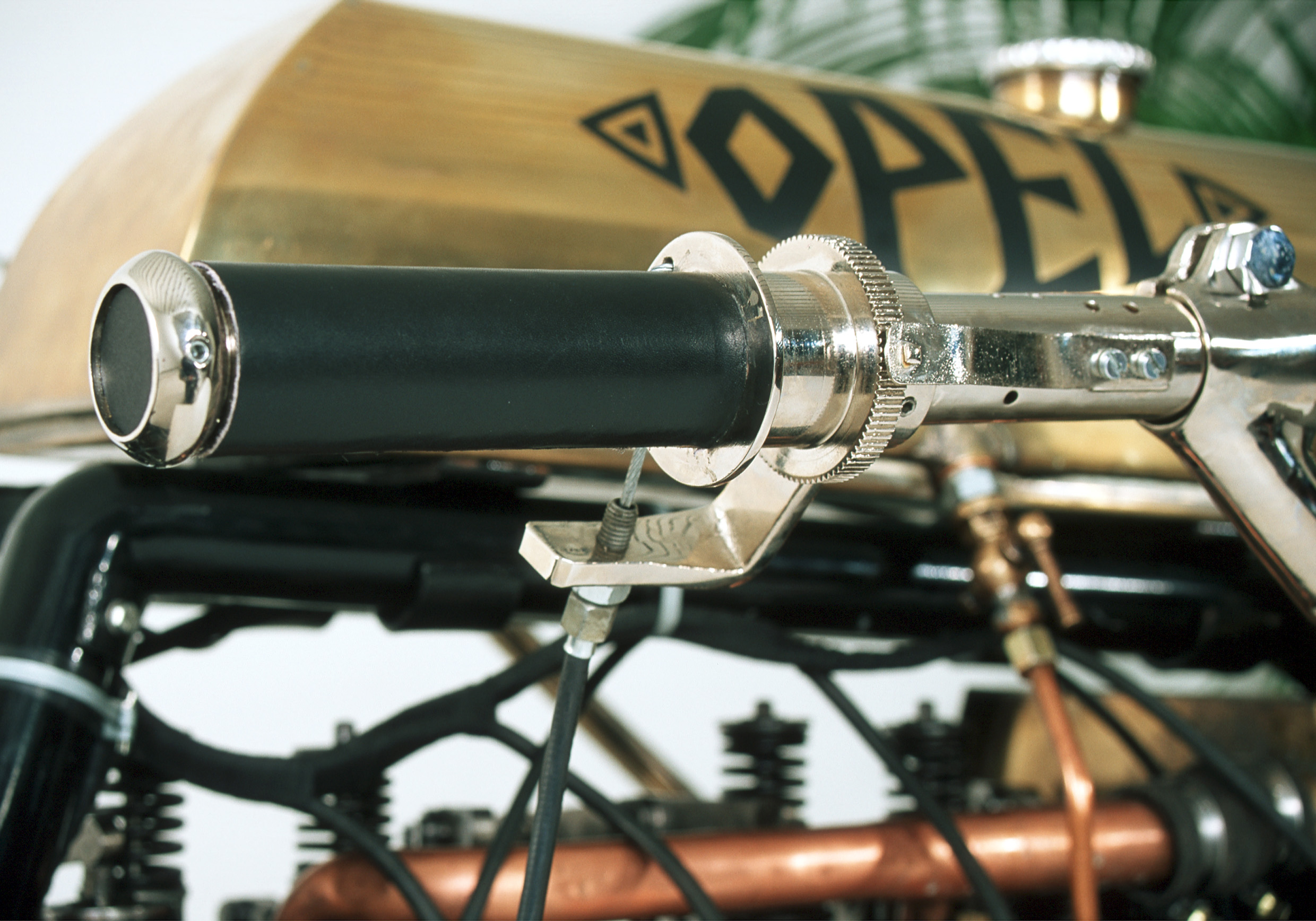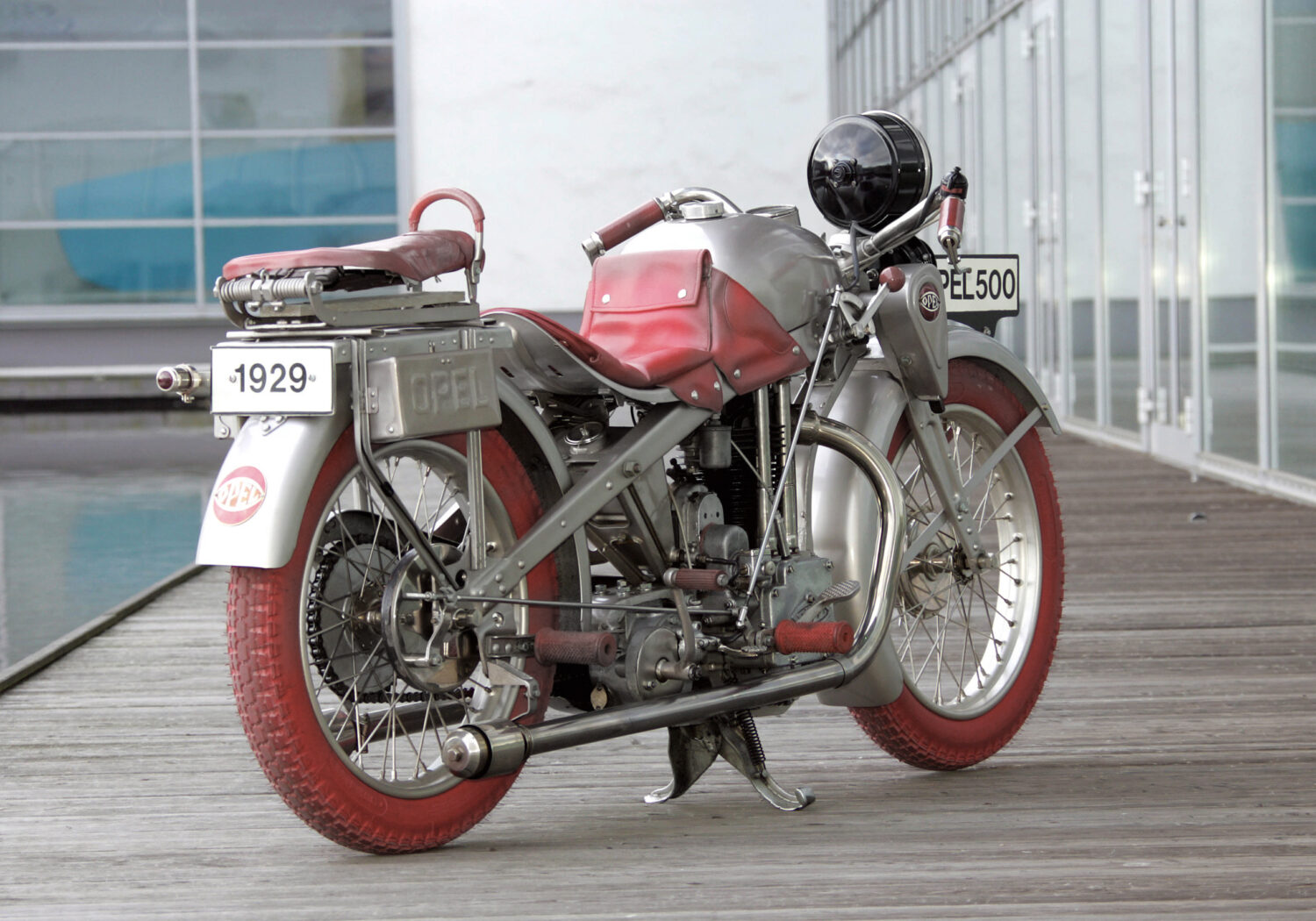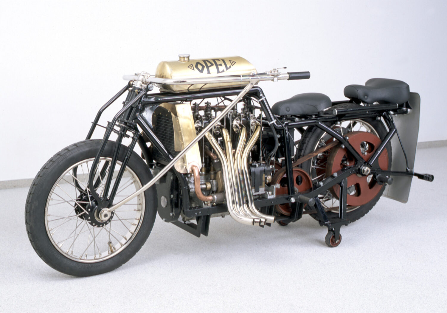 À l’automne de la même année, Opel construisit sa première « bicyclette à moteur », une appellation particulière étant donné que les motos d’époque ressemblaient très peu à celles que nous connaissons aujourd’hui. Elles possédaient un cadre de bicyclette sur lequel un réservoir et un moteur monocylindre étaient installés (verticalement dans le cas de l’Opel). Ils étaient reliés à la roue arrière par un bracelet en cuir. Tout cela, bien sûr, sans renoncer aux pédales, car la fiabilité d’un moteur à combustion était encore à prouver. Sans parler du fait que la puissance de ces moteurs n’était souvent pas suffisante pour franchir les montées les plus raides! Le prix relativement abordable (700 marks) de l’Opel 2 PS a contribué au succès immédiat de la première moto Opel.