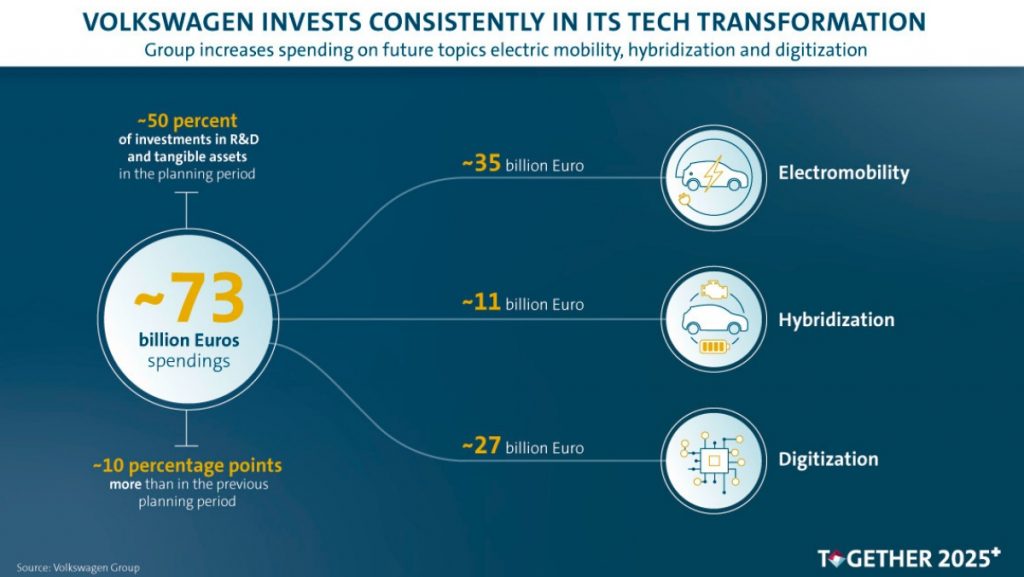 Le Groupe Volkswagen accélère sa transformation pour devenir une entreprise de mobilité digitale. Comme il en a été décidé lors du Cycle de Planification 69 (Planning Round 69), le Groupe va consacrer environ 73 milliards d’euros à l’électrification, aux motorisations hybrides et à la technologie digitale au cours des cinq prochaines années.