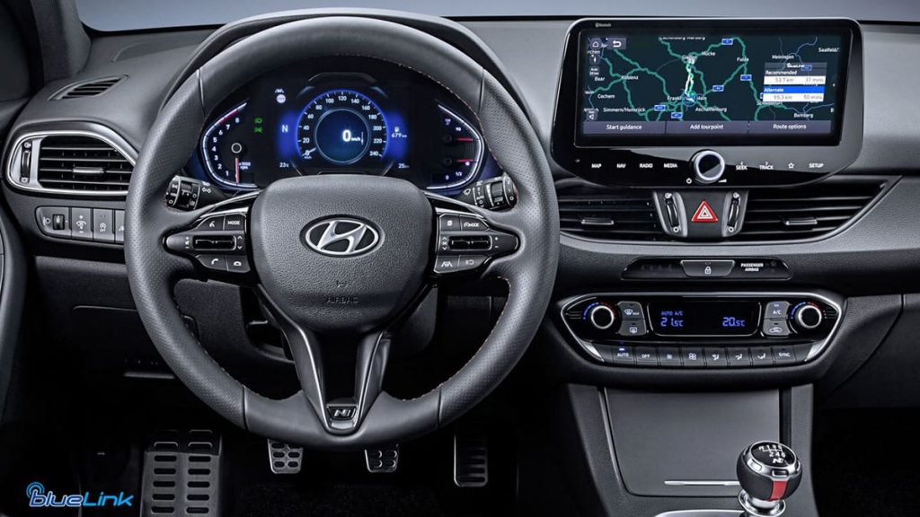 La nouvelle version de Bluelink intègre une nouvelle interface utilisateur, caractérisée par un écran noir et des icônes bleues. L’utilisateur peut choisir entre trois gammes de couleurs et un mode nuit optimisé. Cette interface affiche l’heure, la météo et si l’utilisateur le souhaite, le guidage. Elle permet aussi de consulter rapidement une série d’informations GPS, dont la vitesse actuelle du véhicule et la densité du trafic.