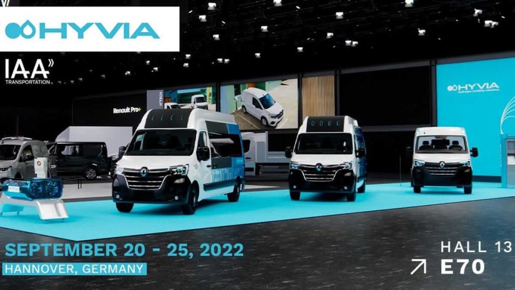 - HYVIA participe à l’IAA Transportation d’Hanovre en Allemagne, du 20 au 25 septembre 2022, aux côtés du stand de Renault (E70 – Hall 13). La marque expose pour la première fois sur un salon automobile majeur l’ensemble de sa gamme de véhicules hydrogène : Master Van H2-TECH, Master City Bus H2-TECH (dans une version sublimée) et Master Châssis Cabine H2-TECH, ainsi que des prototypes de station de recharge H2 et pile à combustible.