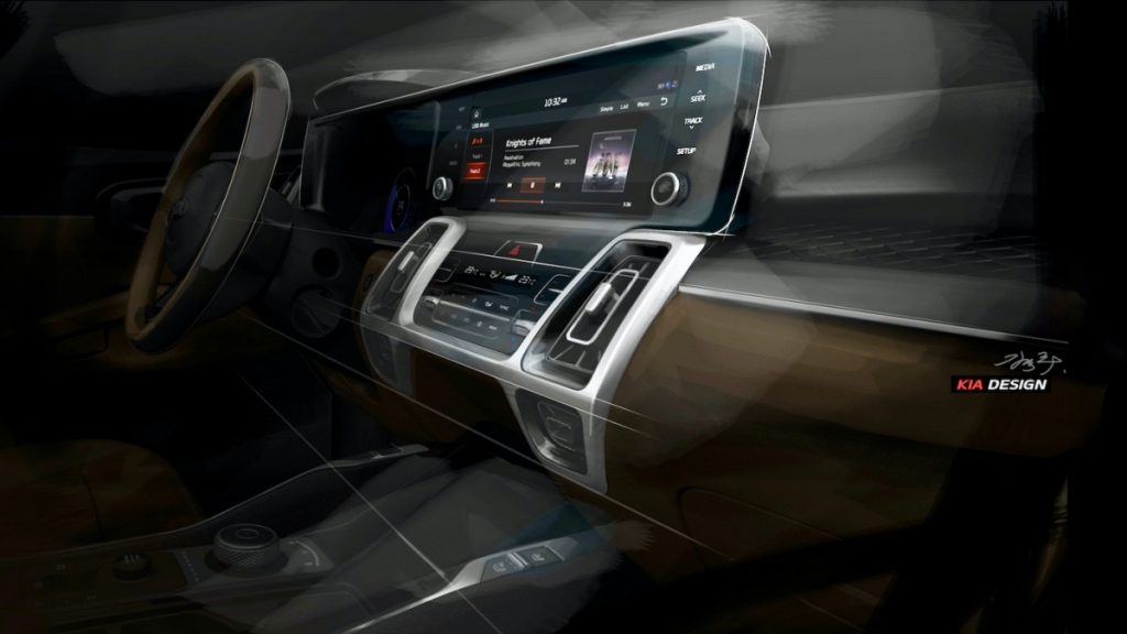 Kia affirme que le tableau de bord offre des expériences visuellement intuitives et un sens du contrôle rendu possible par les technologies de pointe. Les croquis de conception révèlent également un levier de vitesses rotatif pour la transmission automatique situé sur la console centrale entre les sièges avant.