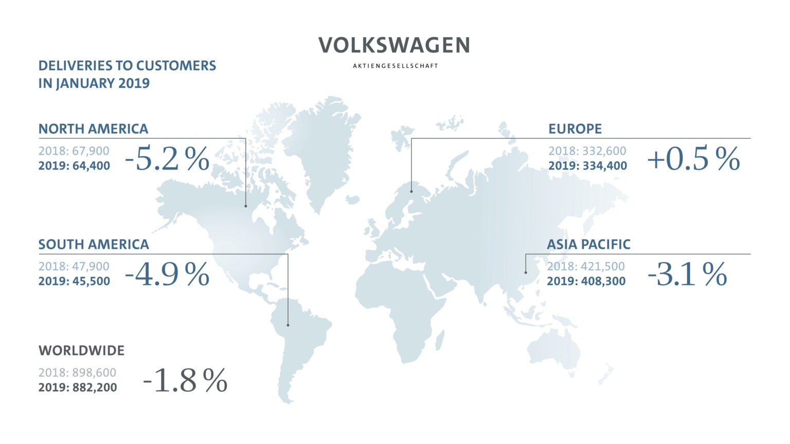 En Europe, les marques du Groupe Volkswagen ont livré un total de 334 400 véhicules en janvier 2019, soit une hausse de 0,5% par rapport au même mois l’an dernier. La performance du Groupe a été particulièrement bonne en Europe Centrale et de l’Est où 56 100 véhicules ont été livrés, soit une progression de 3,3%. Avec 278 300 unités, les livraisons du Groupe en Europe de l’Ouest restent stables. En Allemagne, les marques du Groupe ont enregistré une hausse de leurs livraisons avec 98 600 véhicules vendus (+0,7%).