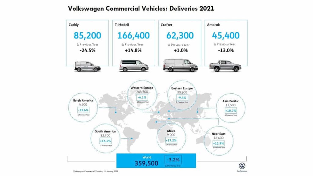 L’Amarok, non commercialisé en Europe en 2021 et fabriqué uniquement en Argentine dorénavant, a vu ses livraisons baisser pour s’établir à 45 400 unités (contre 52 100 l’année précédente). Le nouvel Amarok sera lancé l’été prochain. Il résulte, pour la première fois, de la coopération avec Ford et sera de nouveau disponible en Europe.