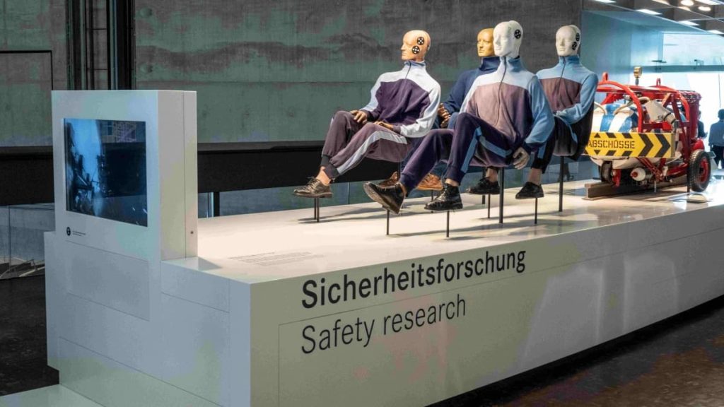 Des mannequins : Non, ce ne sont pas des mannequins, mais des instruments de mesure. Les quatre mannequins de crash test du musée Mercedes-Benz, dans la salle de légende 5 « Visionnaires – Sécurité et Environnement, 1960 à 1982 », sont les d’ambassadeurs de la sécurité des véhicules. Mercedes-Benz effectue des crash tests depuis plus de 60 ans. Les mannequins ont été utilisés presque dès le début. Ces tests permettent de s’assurer que les nouvelles générations de véhicules offrent une sécurité répondant à des normes élevées.