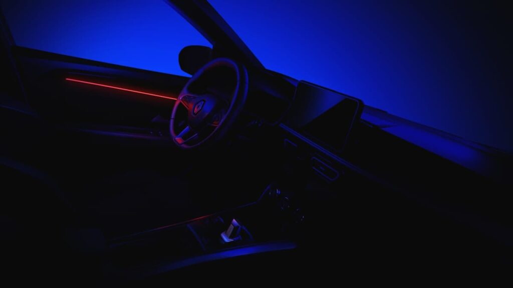 La photo permet également de découvrir la console haute, le volant orné du logo Nouvel’R et l’ambiance lumineuse. Cette dernière se diffuse notamment sur les panneaux de porte à l’avant, optimisant le bien-être du conducteur et des passagers. Le conducteur peut en effet choisir, selon ses envies, l’environnement lumineux et le style de conduite au moyen du MULTI-SENSE.