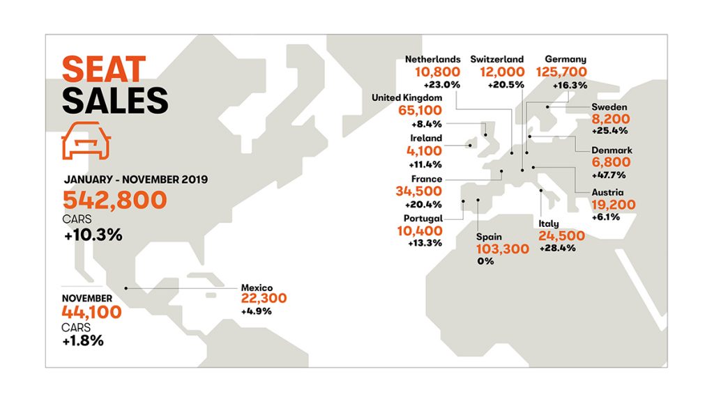 SEAT a battu son record historique de ventes pour la deuxième année consécutive. De janvier à novembre 2019, le constructeur automobile espagnol a livré 542 800 voitures dans le monde, soit 10,3% de plus qu’à la même période l’année précédente.