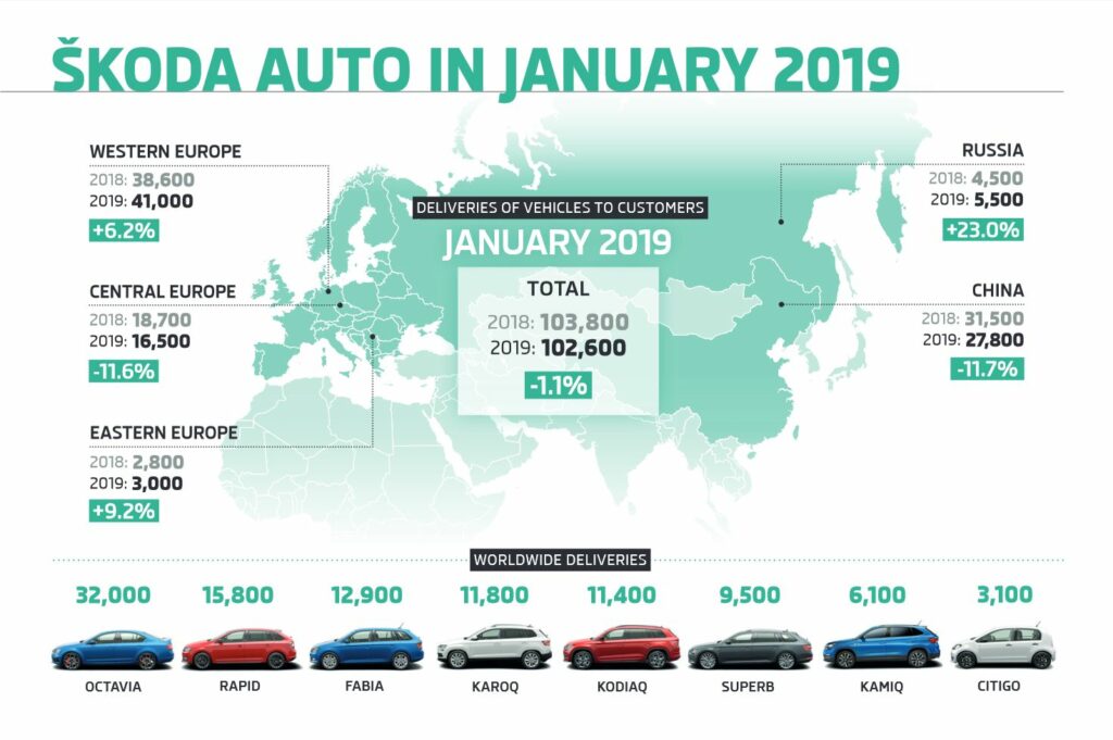 SKODA a vu ses livraisons augmenter sur certains marchés, notamment en Europe occidentale (41 000 livraisons, +6,2%) et en Russie (5 500 livraisons, +23%). Dans l’ensemble, les livraisons ont légèrement diminué de -1,1% par rapport à l’année précédente (janvier 2018: 103 800 livraisons). La principale raison de cette évolution globale est le déclin général des marchés des voitures particulières en Chine et en Europe centrale. Le best-seller de SKODA reste l’OCTAVIA et le constructeur tchèque enregistre une forte hausse des livraisons de son SUV compact, le KAROQ.