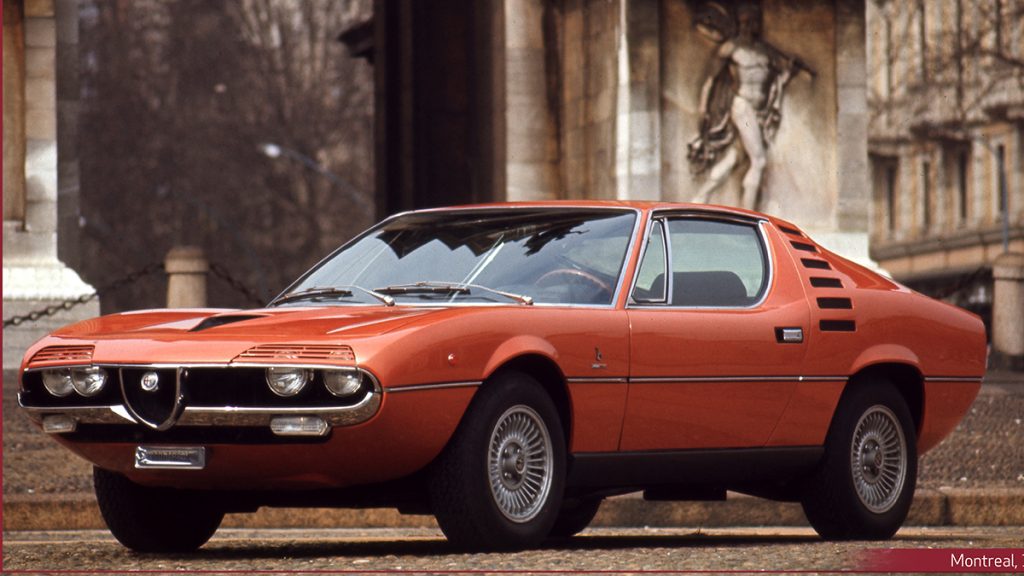 En 1967, les nations du monde entier présentèrent leurs meilleurs exploits en matière technique et scientifique lors de l’Exposition universelle de Montréal. Il fut demandé à Alfa Romeo de créer un symbole technologique pour l’Exposition – un modèle qui représente l’aspiration la plus élevée de l’homme moderne en matière d’automobiles. Satta Puliga et Busso firent appel à Bertone, qui chargea Gandini de concevoir la carrosserie et l’habitacle du modèle. Le résultat fut un succès retentissant. Les visiteurs nord-américains apprécièrent particulièrement l’élégance et l’aménagement du modèle. Devant l’adhésion du public, une version de série fut développée, qui fut présentée au Salon de Genève en 1970. Au contraire du concept original, la Montreal de série disposait d’un moteur V8 basé sur celui de la Tipo 33, d’une cylindrée portée à 2,6 litres pour une puissance limitée à 200 ch. Le modèle impressionna pour l’époque par sa large palettes de teintes de carrosserie, à la fois pastels et métallisées : du vert (précédemment utilisé sur le concept de l’Exposition universelle) à l’argent, et de l’orange à l’or. L’exploration chromatique est ainsi devenue une tradition typiquement Alfa Romeo. Une tradition qui perdure encore aujourd’hui avec la nouvelle palette de coloris disponible : le Rouge Villa d’Este, l’Ocre GT Junior et le Vert Montreal. Des nuances de couleurs qui puisent leur inspiration dans la longue histoire de la marque.