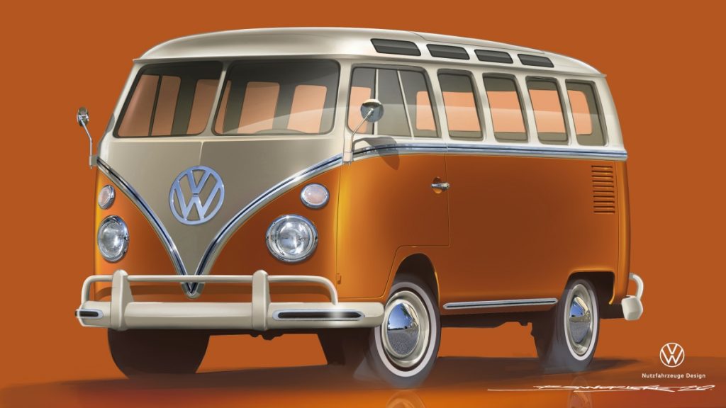 Les premiers croquis montrent le fruit des travaux du centre de design de Volkswagen Véhicules Utilitaires : l’e-BULLI est un véhicule classique high-tech destiné à celles et ceux qui voyagent dans le temps ! Les designers ont modernisé l’extérieur du véhicule emblématique avec sensibilité et finesse. Parmi les nouveaux détails, on trouve des phares ronds à LED, qui évoquent le passage à l’ère moderne dès le premier regard. Ce n’est que lorsque vous regardez à travers les vitres pour découvrir l’habitacle que l’on s’aperçoit que plusieurs éléments diffèrent de ce à quoi l’on s’attend dans un T1.