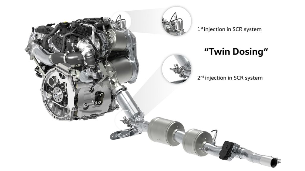 Le processus de double dosage nécessite un second catalyseur SCR qui est situé dans le dessous de caisse du véhicule. Sachant que la distance jusqu’au moteur est plus importante, la température d’échappement en amont du deuxième catalyseur peut être inférieure de 100 °C. Cela élargit la fenêtre de post-traitement des gaz d’échappement: même à des températures de gaz d’échappement proche du moteur de + 500 °C, le système peut atteindre des taux de conversion très élevés. En outre, un catalyseur de blocage en aval du système SCR empêche l’excès de rejet d’ammoniac.